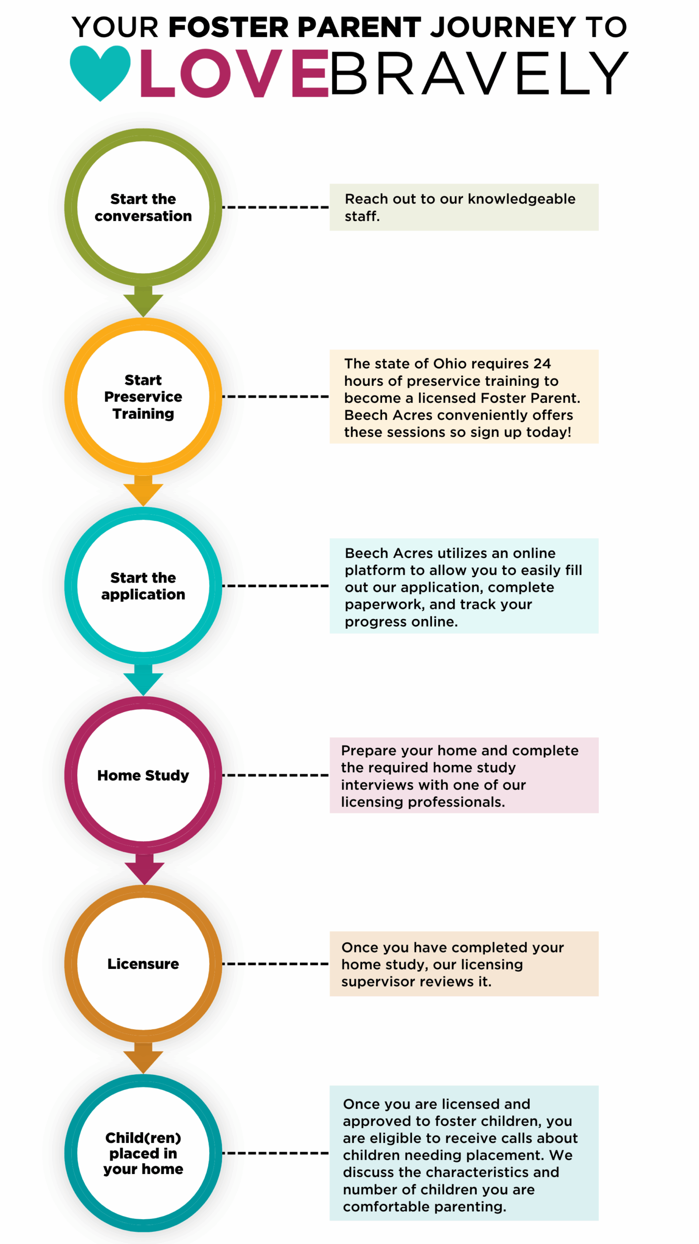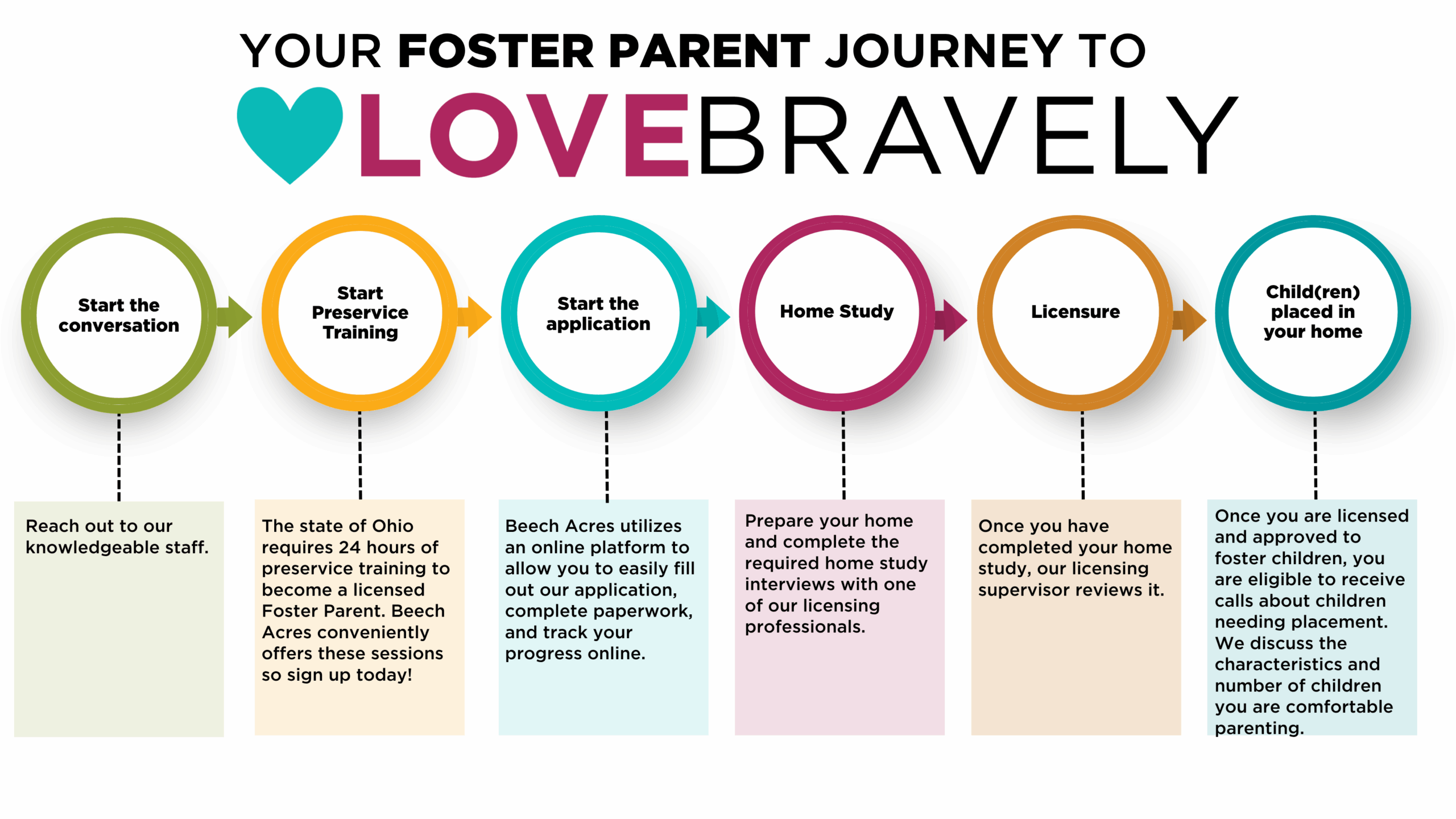 The state of Ohio requires 24 hours of preservice training before becoming a licensed foster parent. Beech Acres offers: